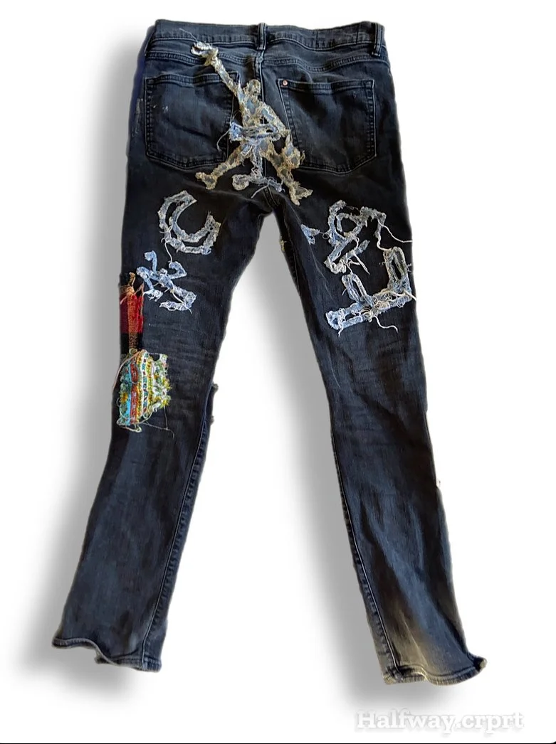 Image 1 of 4 Image 2 of 4 Image 3 of 4 Image 4 of 4 WTfaktish Jeans $153.00 Black patchwork jeans with various religious and commercial symbols and bootcut zips. Add To Cart Added! Black patchwork jeans with various religious and commercial symbols and bootcut zips.